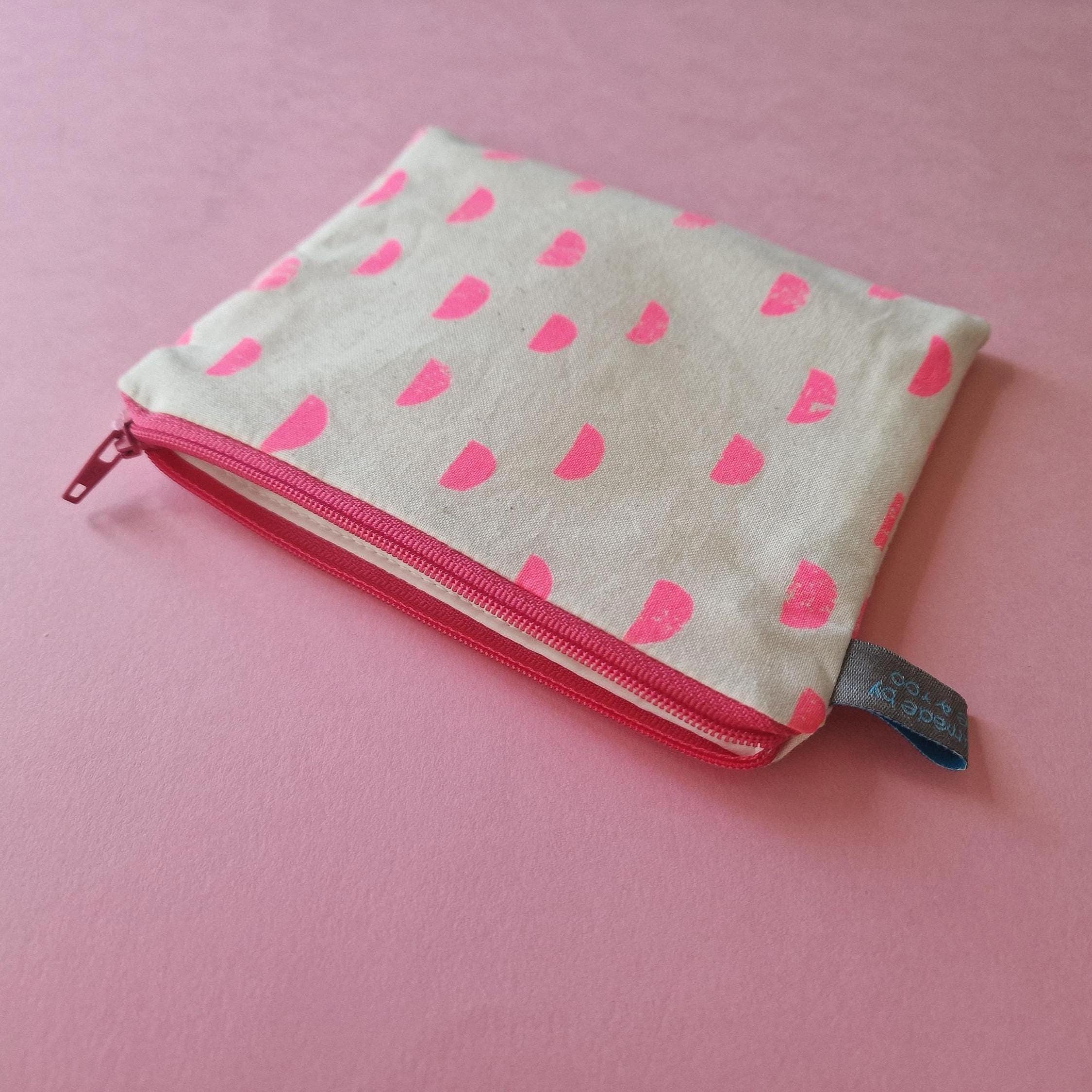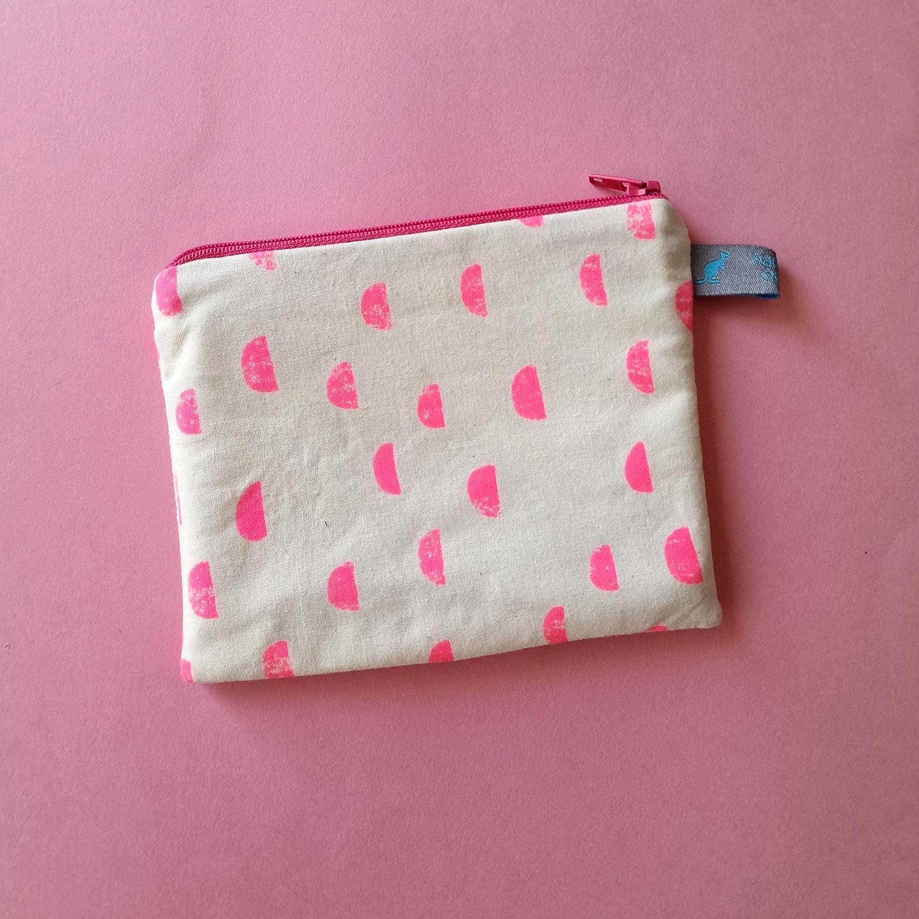 Small cosmetic pouch with neon pink semi circle design with waterproof lining and zipper fastening.