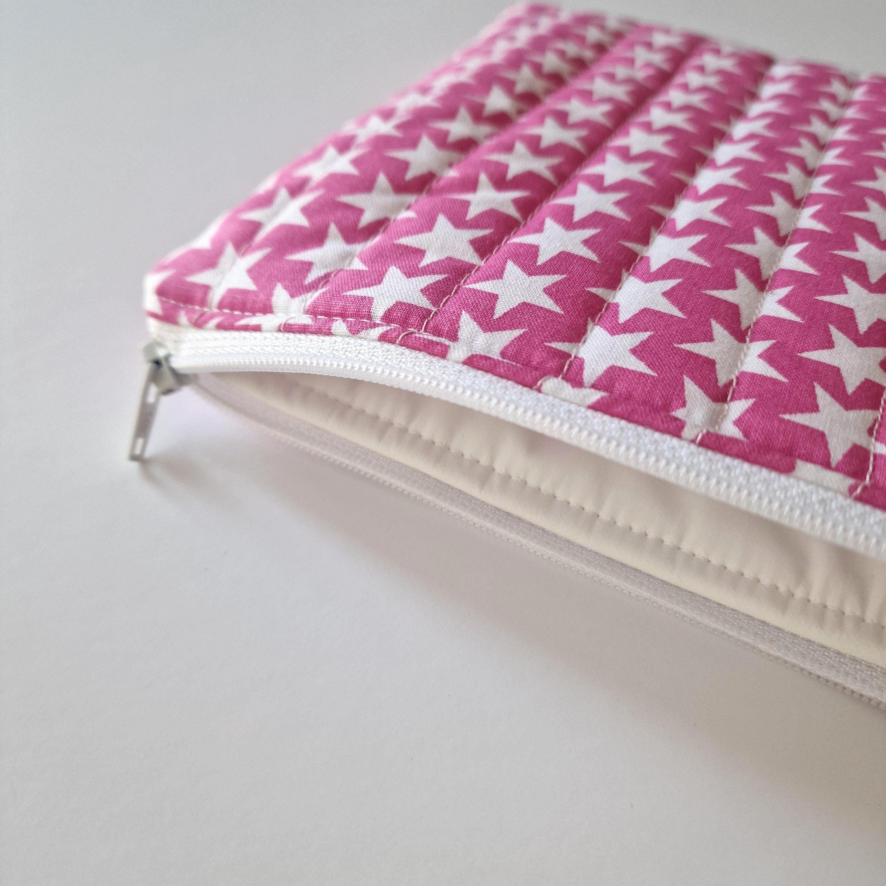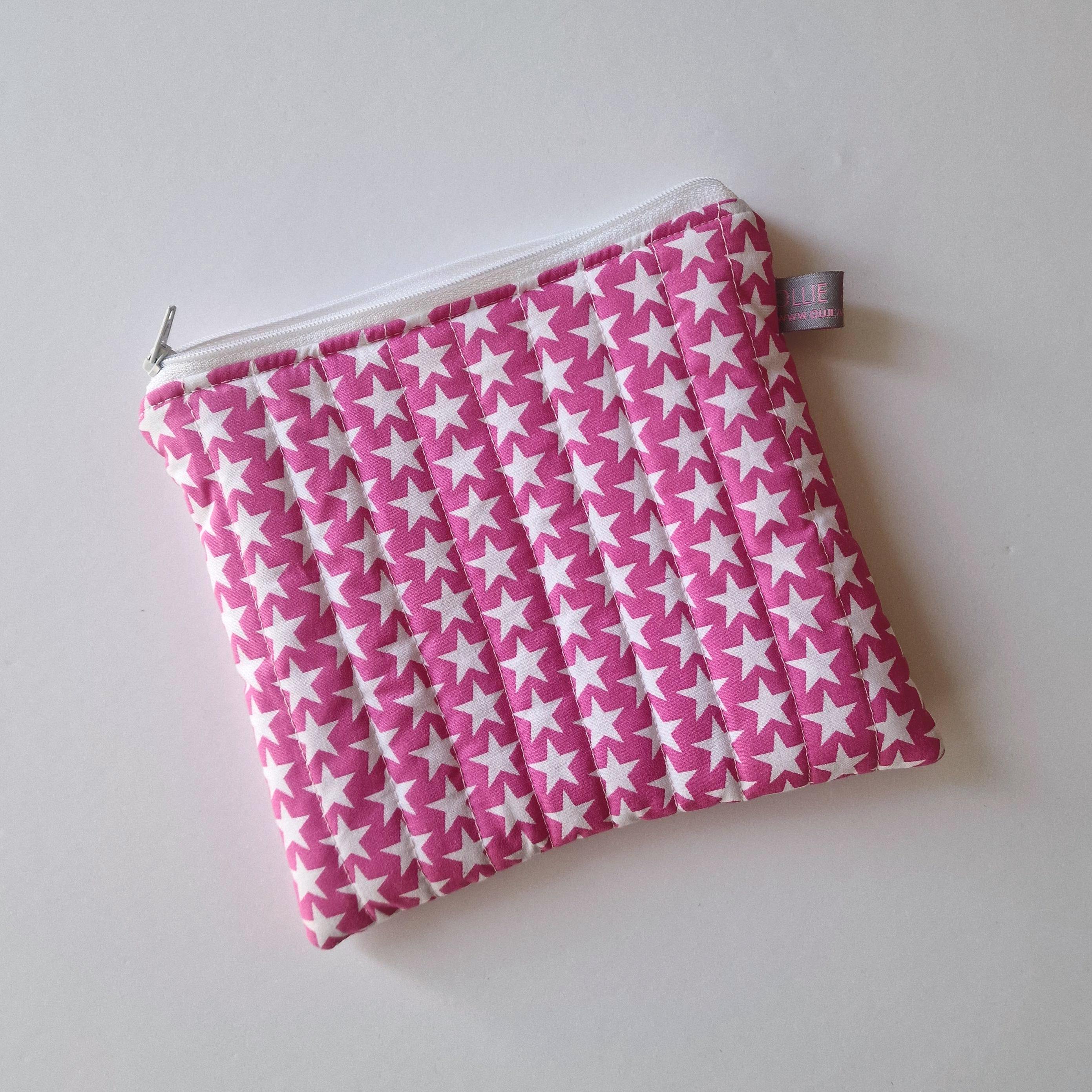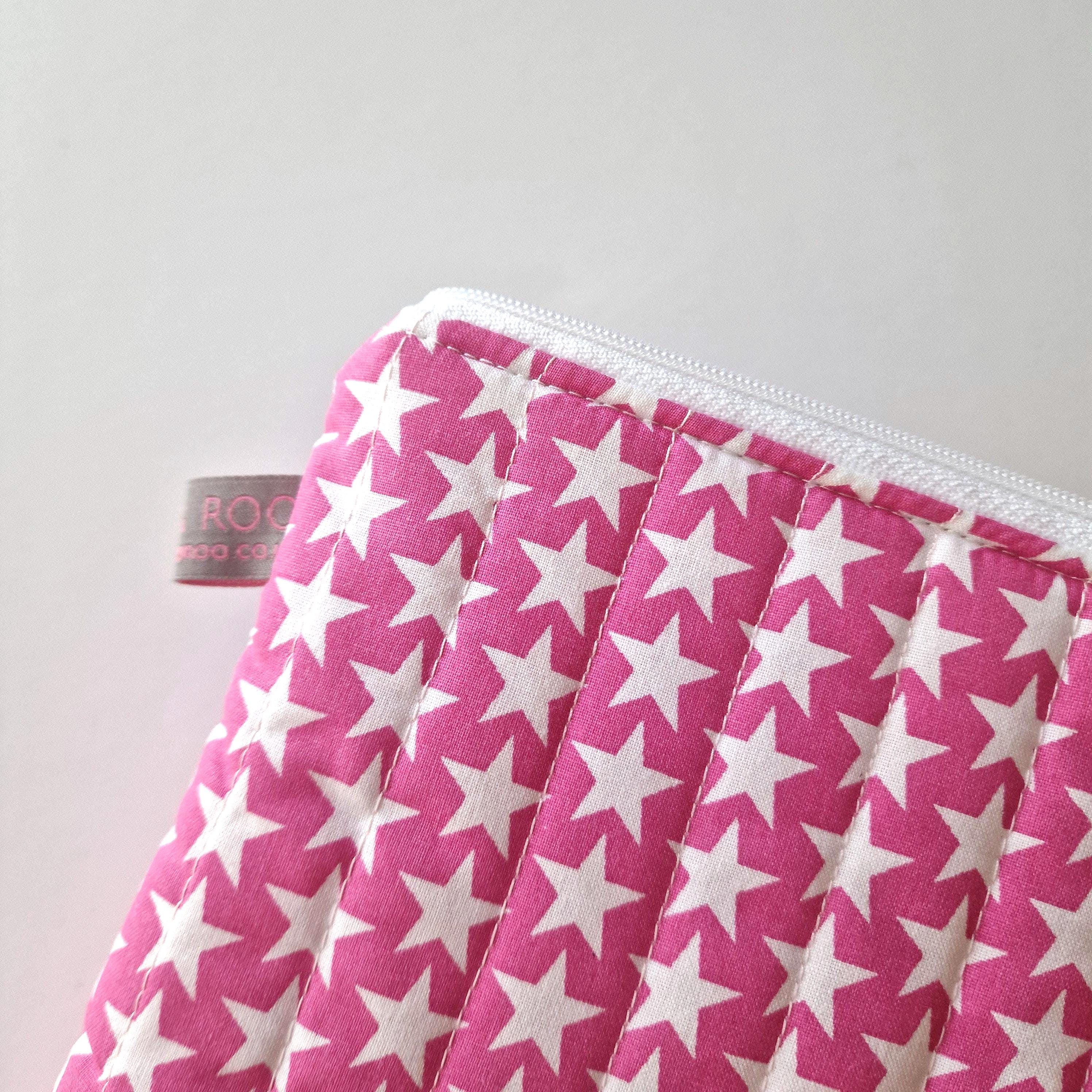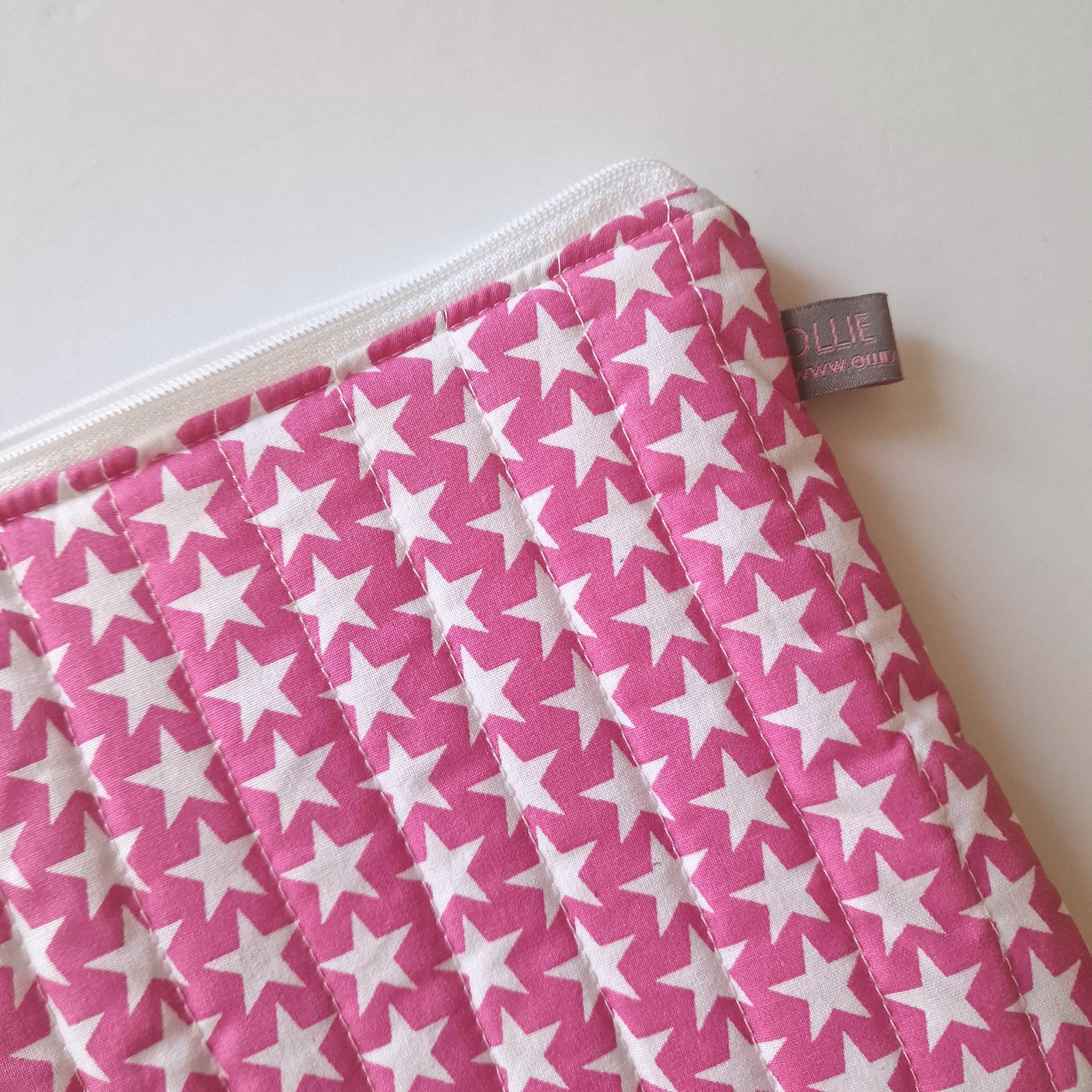 Small handmade quilted cosmetic pouch with star design with waterproof lining and zipper fastening.