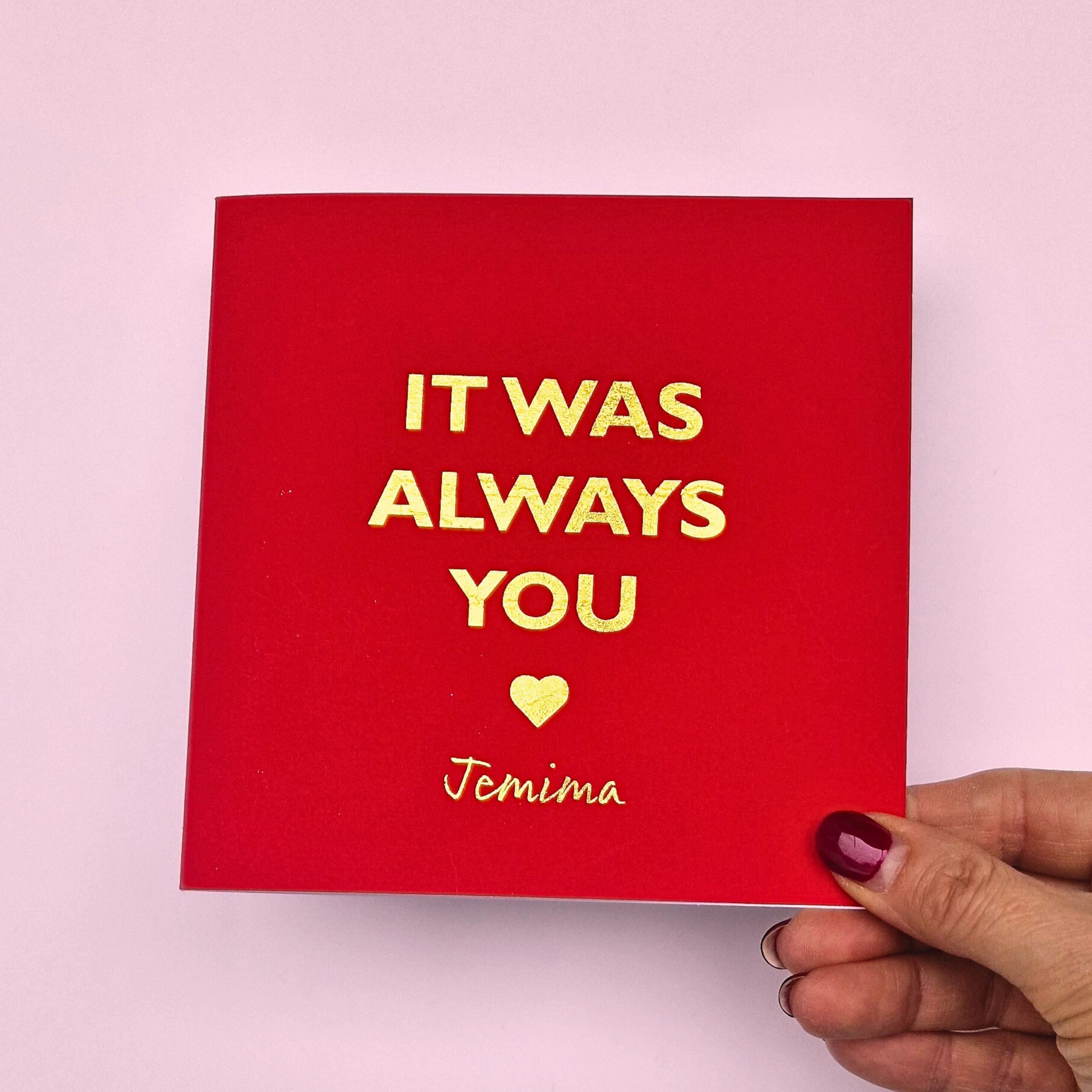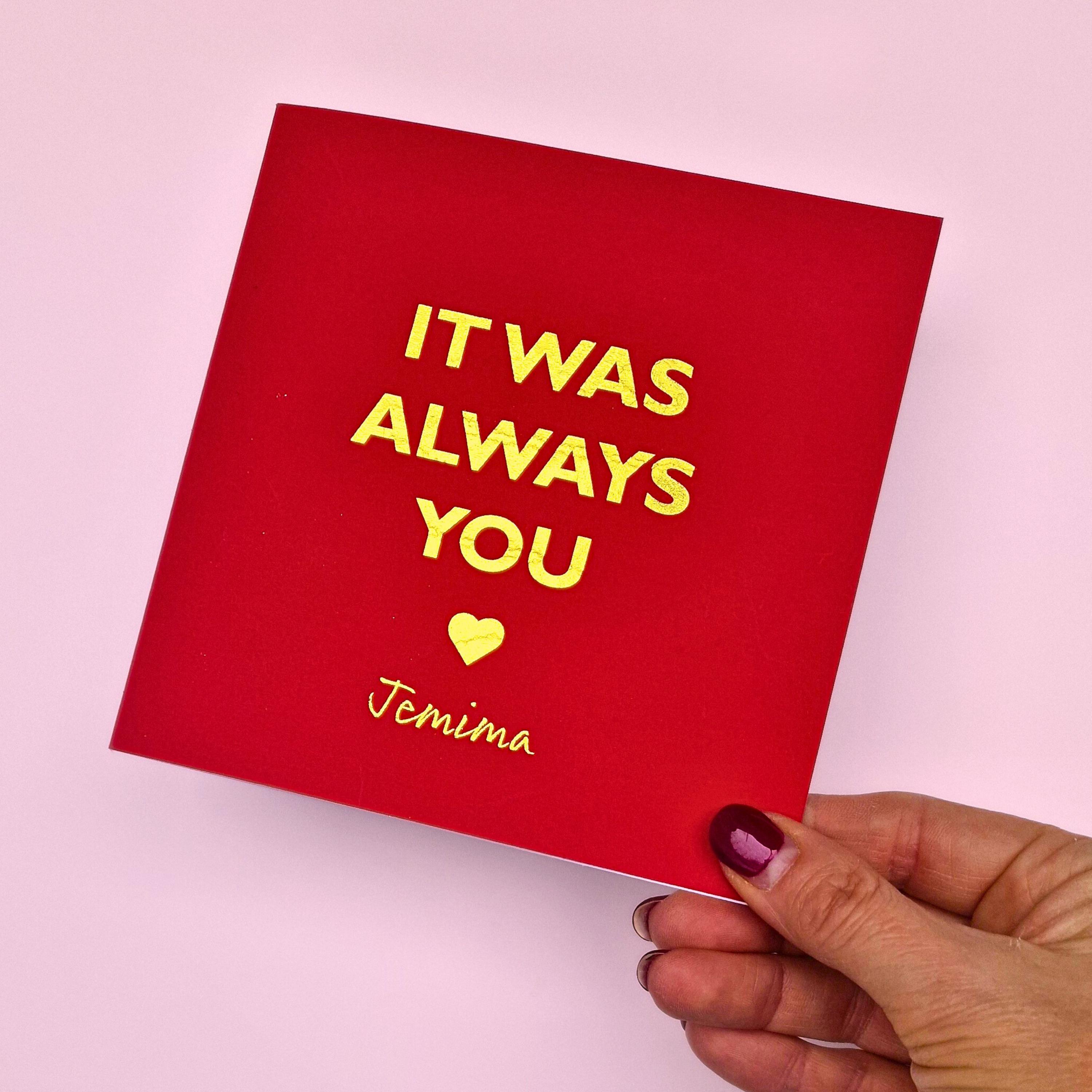 • Elegant gold foil text reading "IT WAS ALWAYS YOU" creates a playful and loving sentiment