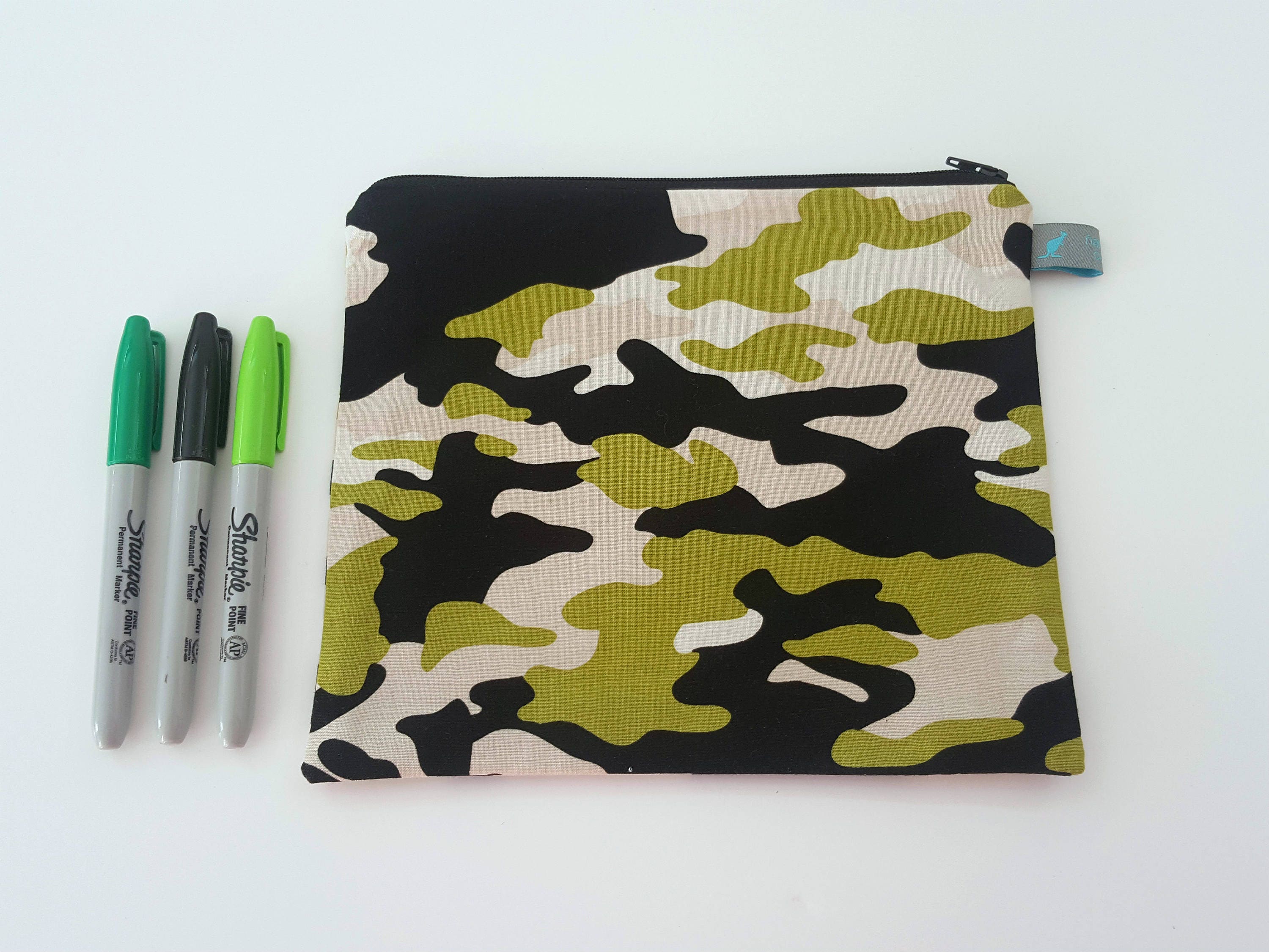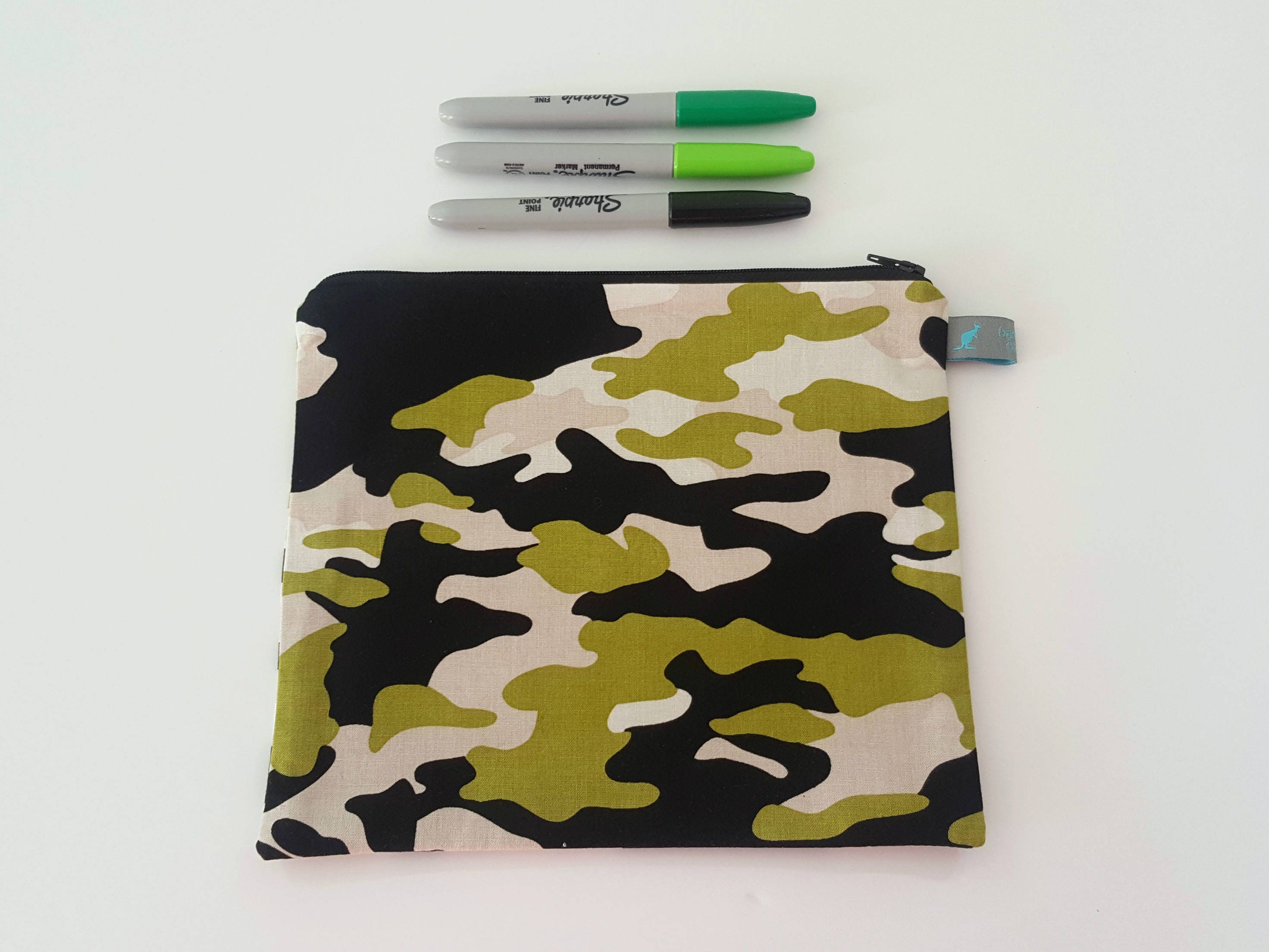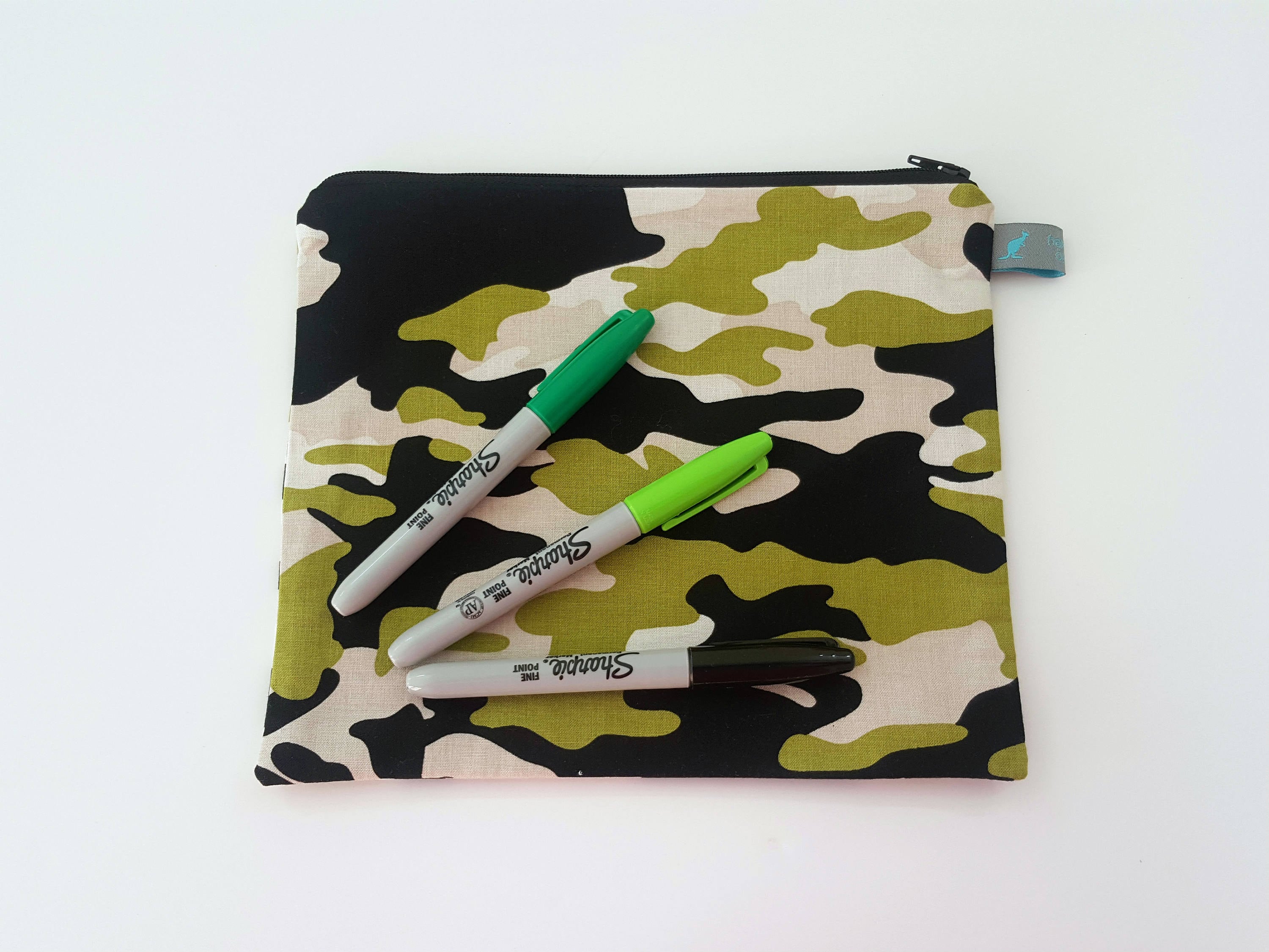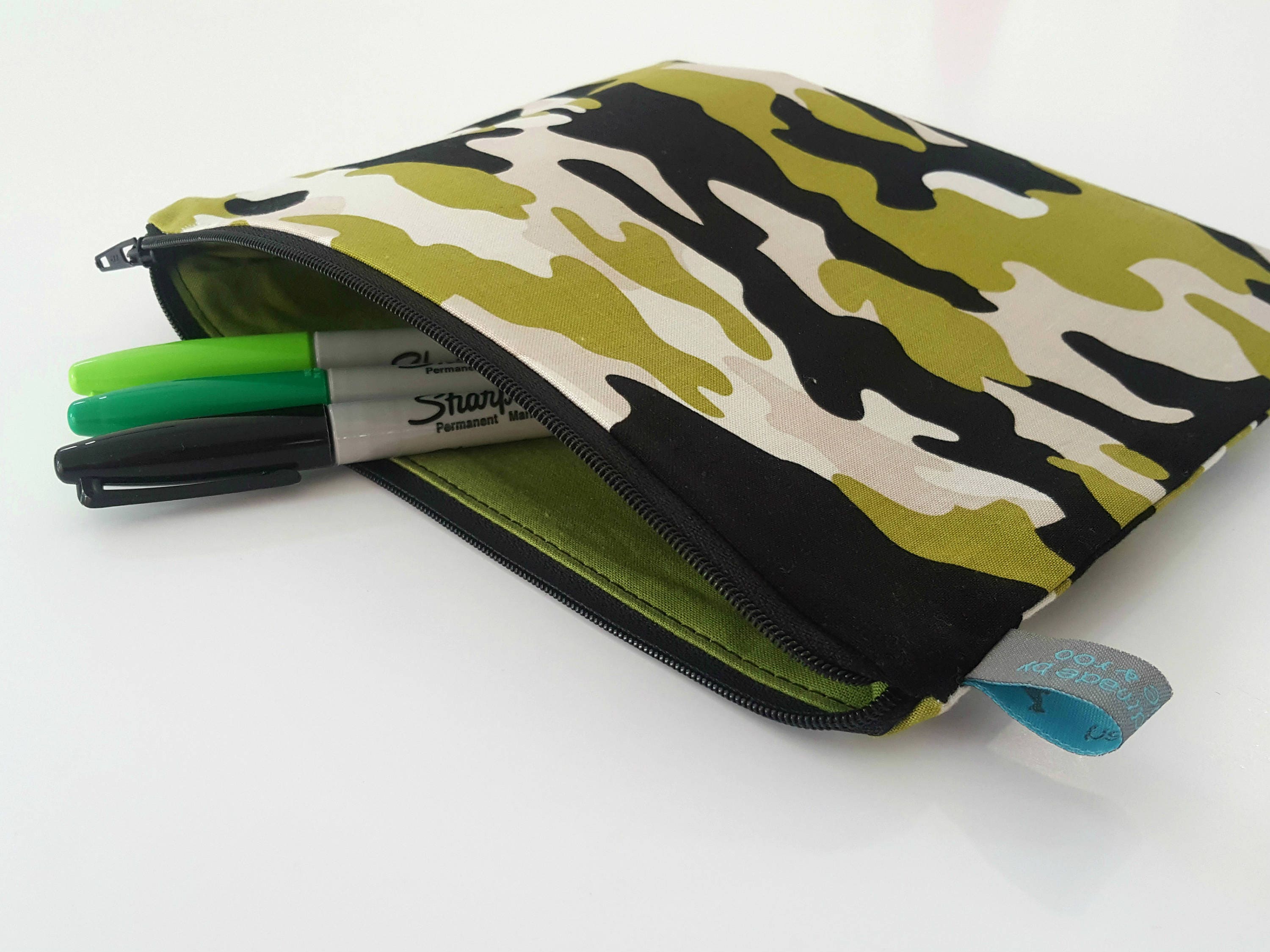 Pencil Case / Zipper pouch in camouflage design on a with green cotton lining.