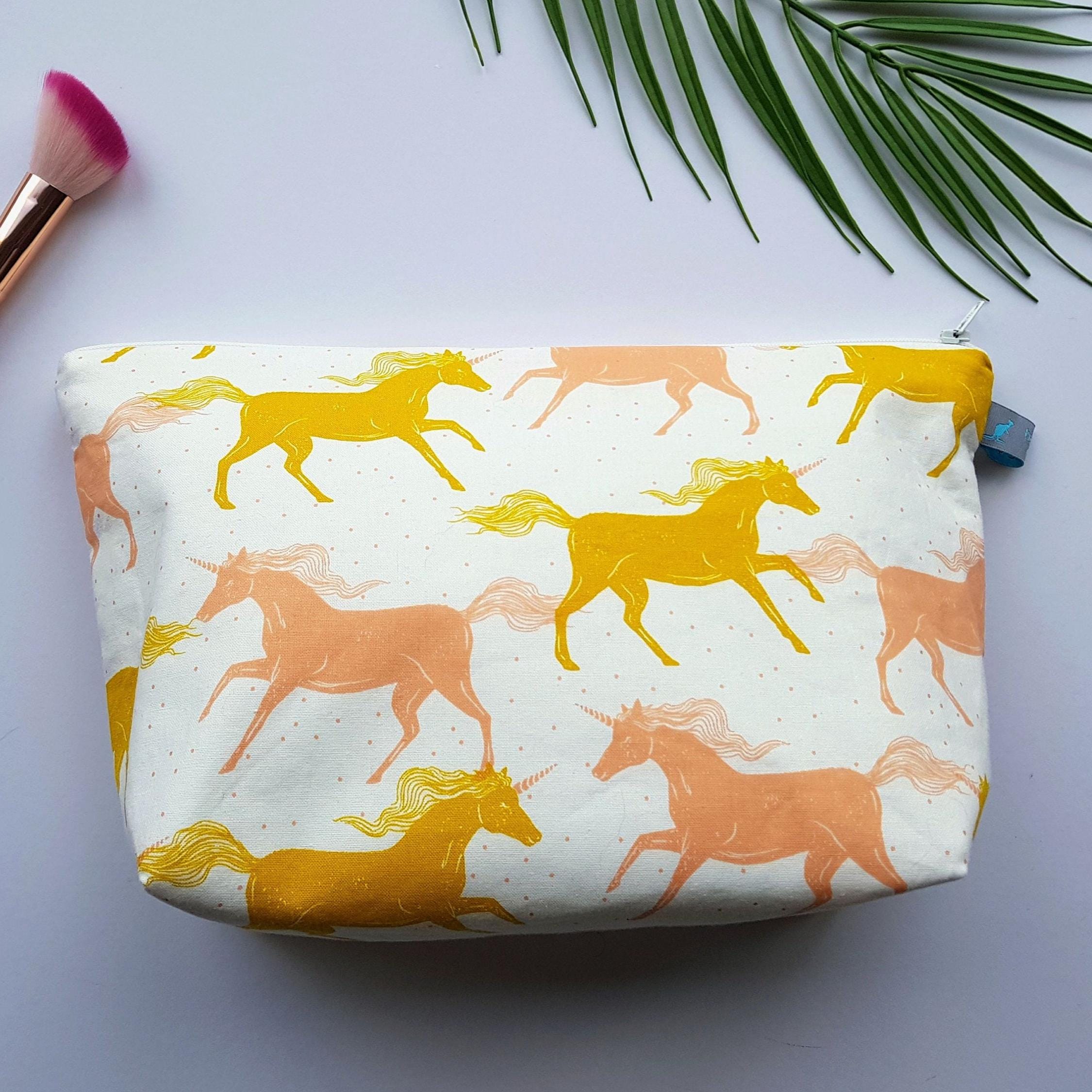 Unicorn print large cosmetic bag with waterproof PUL lining. Perfect as a makeup bag, cosmetic bag or for toiletries. Choose from 2 colours - black and grey unicorns with neon pink horns, or pastel yellow and peach unicorns.