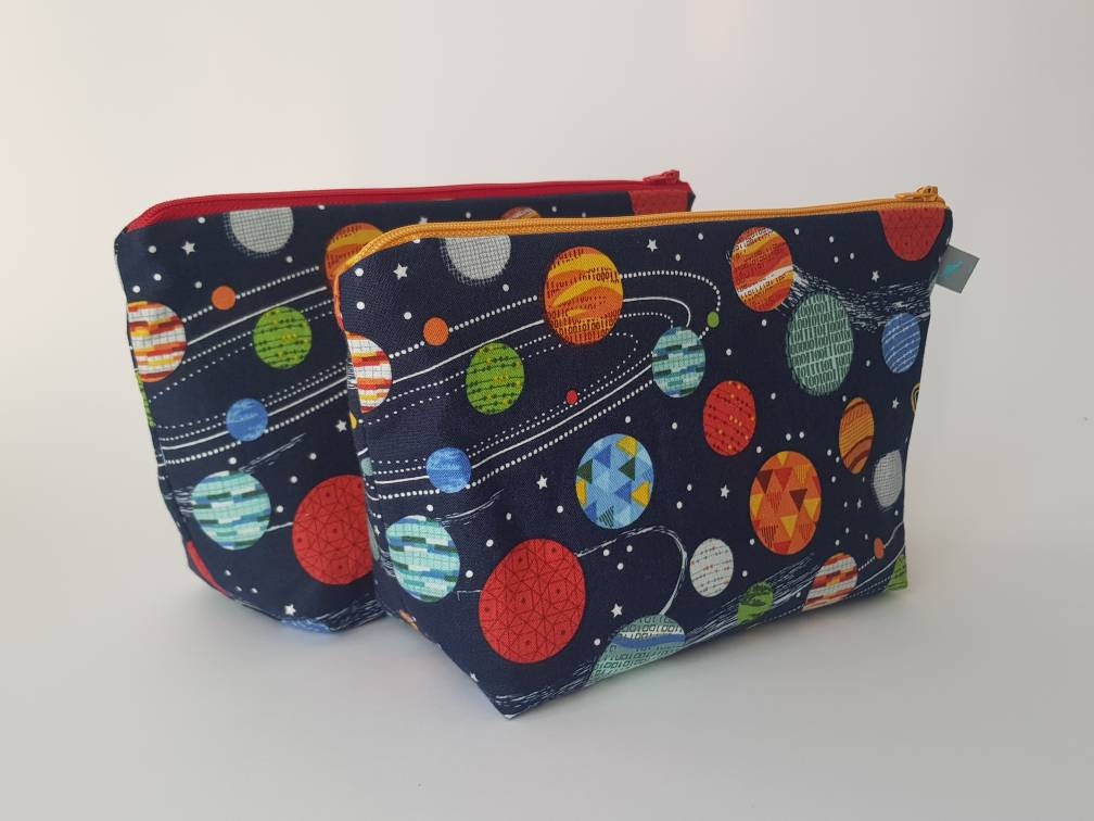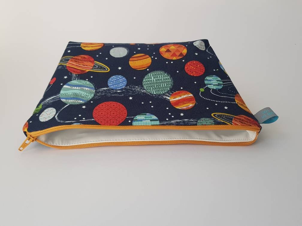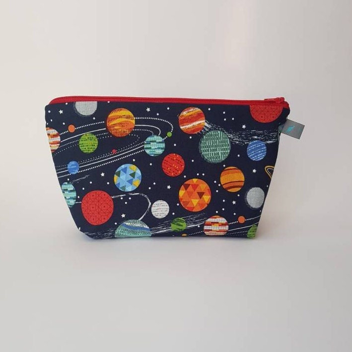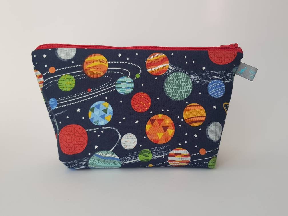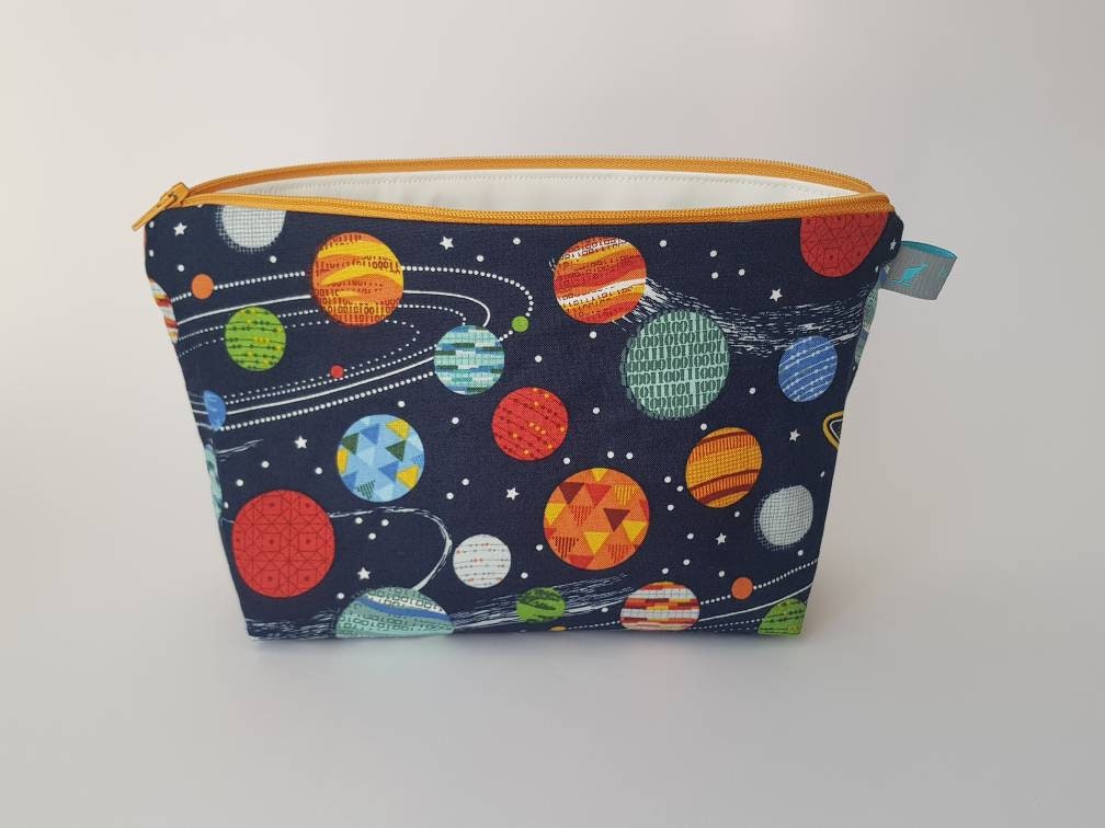 Space/planet print wash bag with waterproof lining.