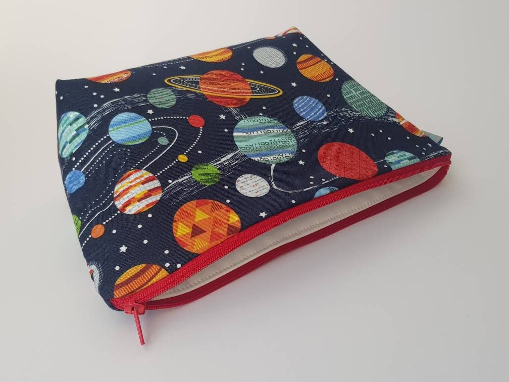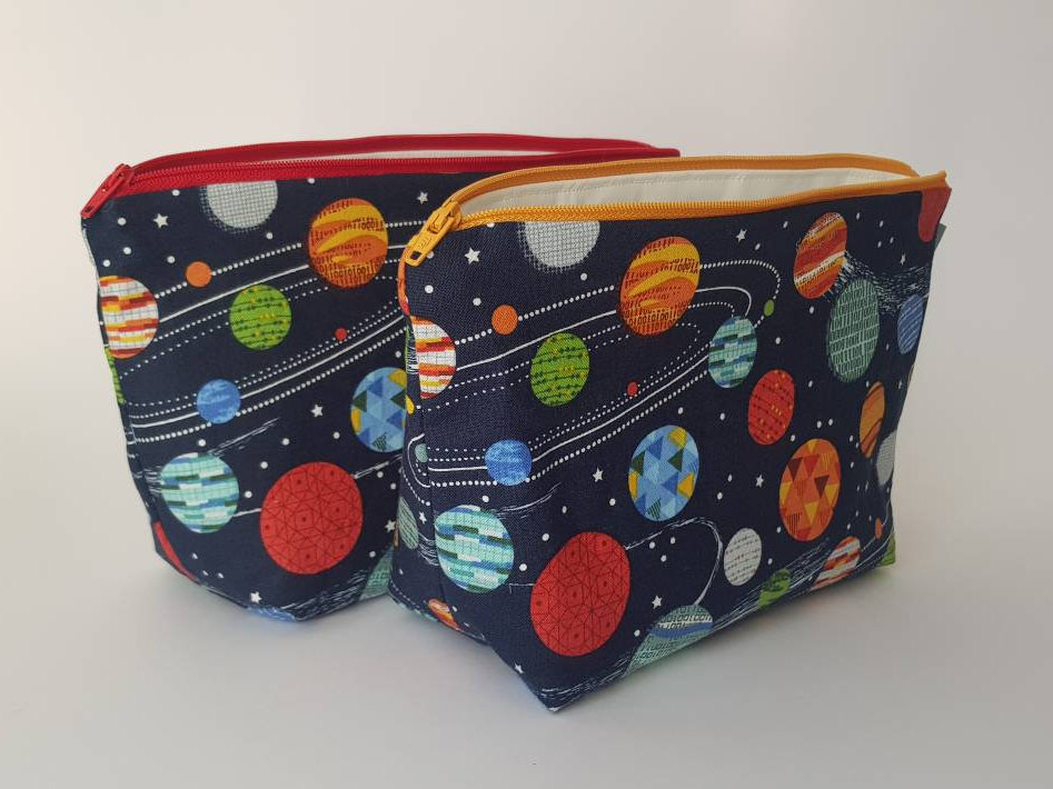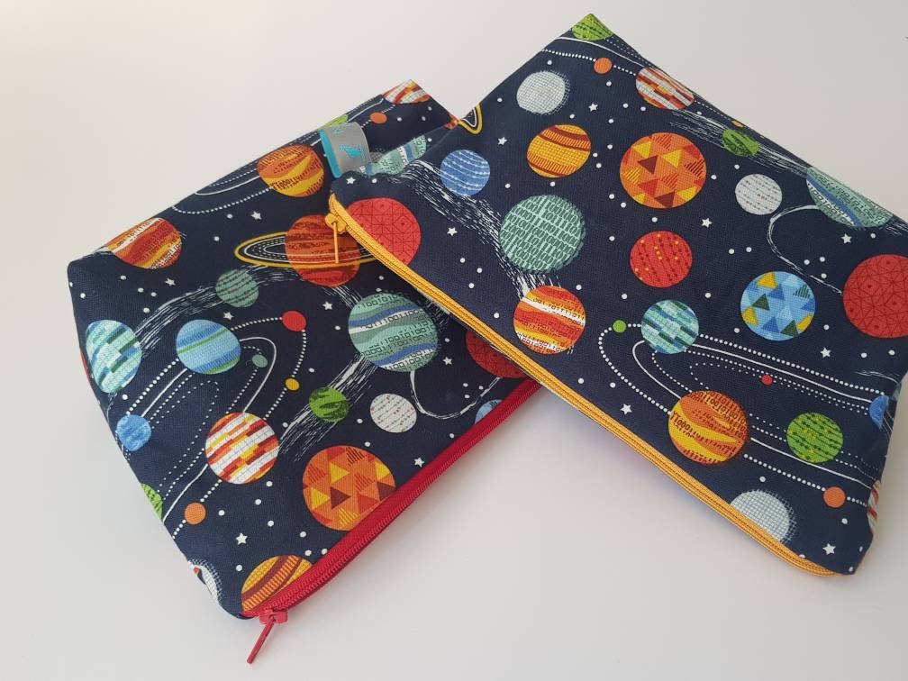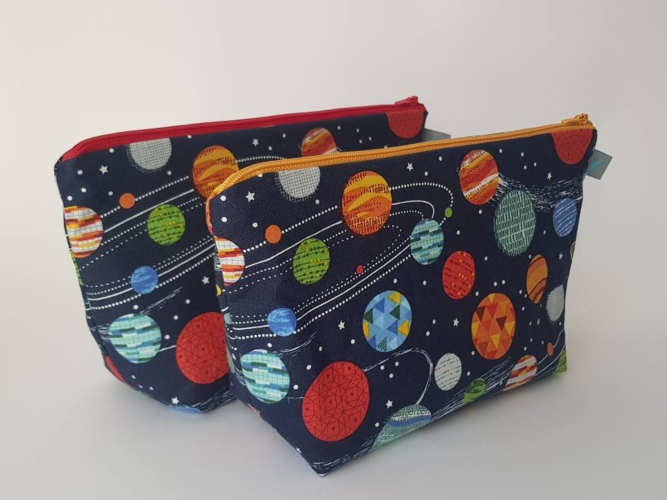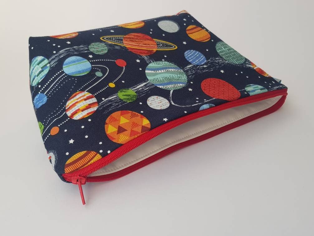 Space/planet print wash bag with waterproof lining.