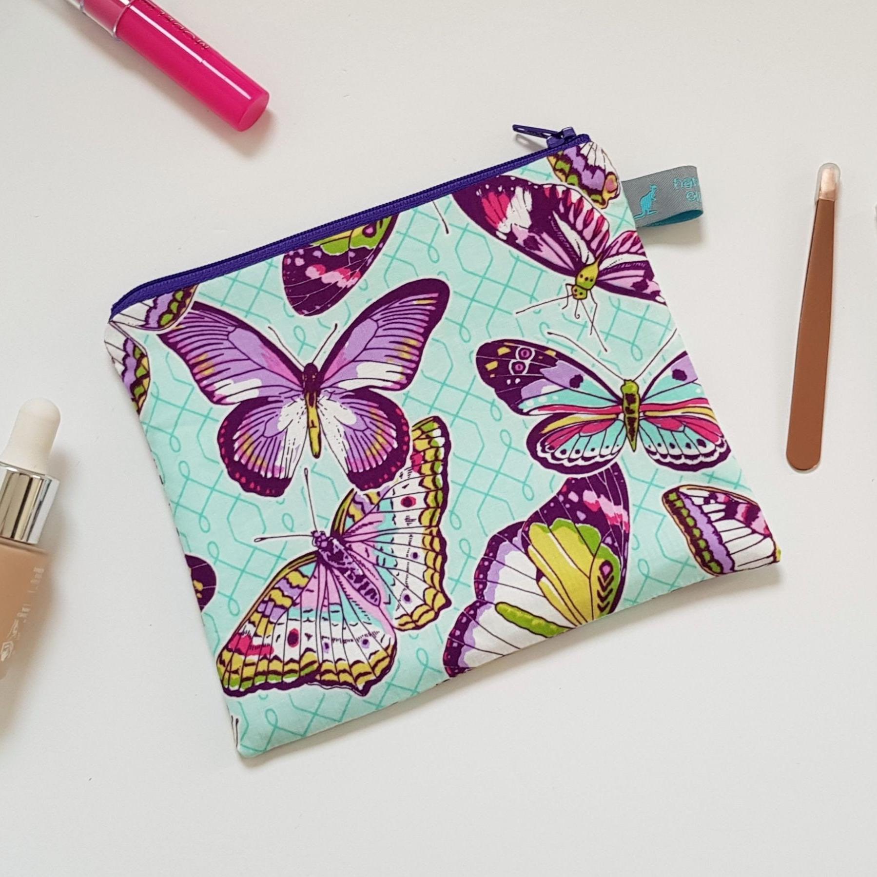 Small cosmetic pouch with butterfly design with waterproof lining.